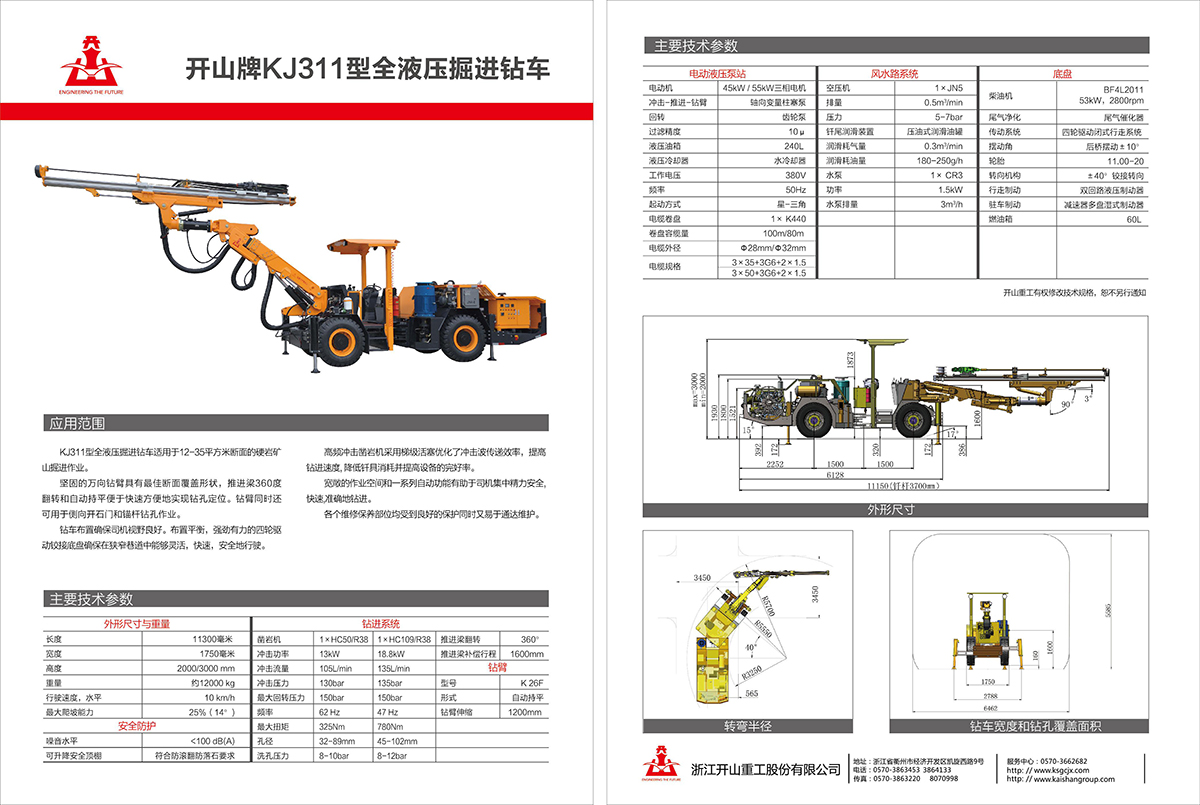 KJ311型全液壓掘進鉆車適用于12-35平方米斷面的硬巖礦山掘進作業(yè)。